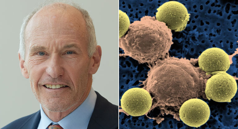 Carl H. June, MD, winner of inaugural 2022 Maria I. New International Prize Scanning electron microscopy of anti-CD3/28 beads (yellow) stimulating CAR T cells (orange). Courtesy of Bruce Levine at Penn Medicine.