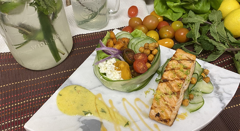 Stop Food Waste Day 2022: Hot Honey Chickpea Salad with Grilled Salmon Citrus Herb Agua Fresca