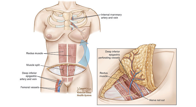 Traditional approaches to autologous breast reconstruction, such as the TRAM lap, transfer a small amount of muscle, along with its related skin and fat, in the reconstruction procedure. This approach sometimes requires a lengthy recovery and loss of movement and strength because of the muscle involvement. In general, the less muscle involved in the procedure, the better your function after recovery.